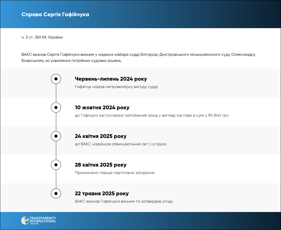 Таким чином Сергій Гафійчук за попередньою змовою з помічницею судді надав неправомірну вигоду судді у розмірі $600 за ухвалення потрібних судових рішень.