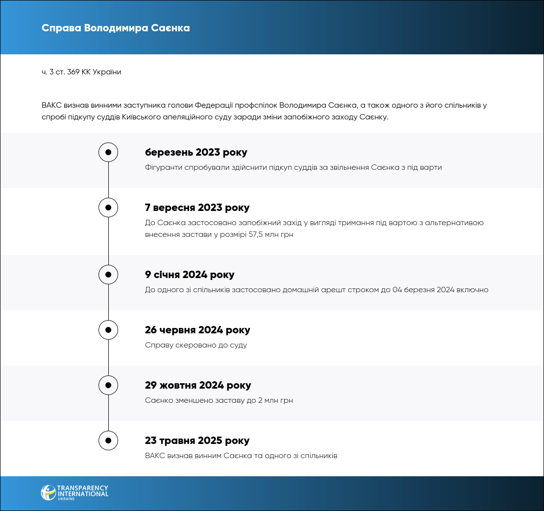 ВАКС визнав винними заступника голови Федерації профспілок Володимира Саєнка, а також його спільника Аркадія Криницького у спробі підкупу суддів Київського апеляційного суду задля звільнення Саєнка з-під варти.