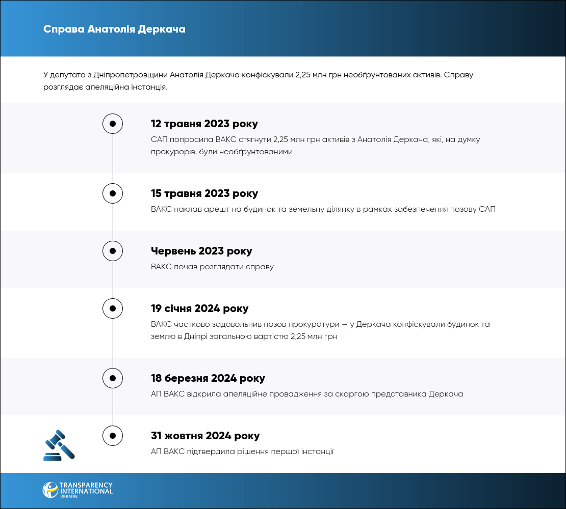 19 січня 2024 року ВАКС конфіскував 2,25 млн грн з секретаря одної з міськрад на Дніпропетровщині Анатолія Деркача. Перед цим у НАЗК встановили, що він необґрунтовано набув будинок та землю в Дніпрі.